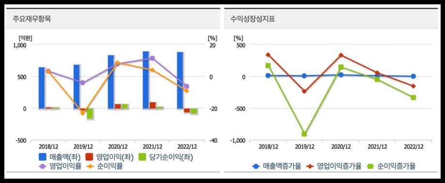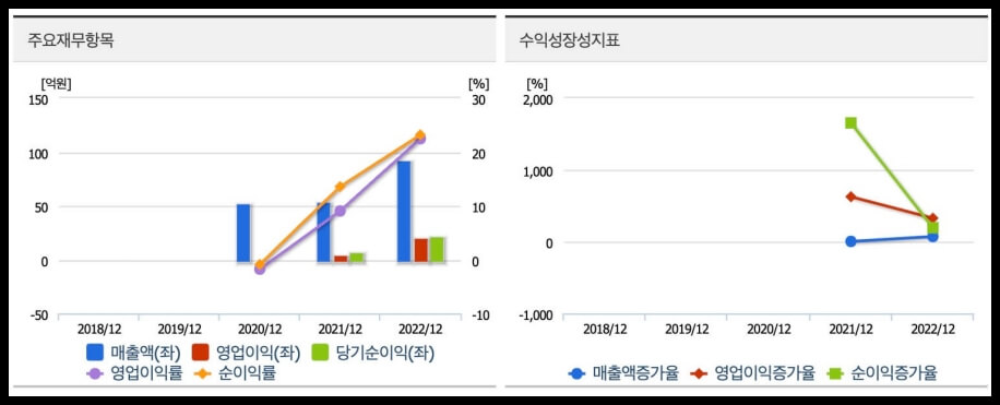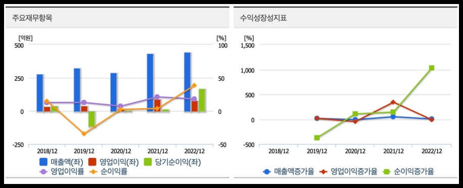 주요 재무항목을 보면 2018년부터 매출액과 순이익률이 꾸준히 늘어 2022년 매출액은 전년대비 71.8% , 순이익은 193.7% 증가하였습니다. 2023년 매출액은 전년 대비 7.8% 증가한 631.7억 원을 기록하며, 창사 이래 처음으로 600억 원을 돌파했습니다. 특히 4분기 매출액은 전년 동기 대비 18.7% 증가한 174억 원을 기록, 분기 최대 기록을 경신했습니다.