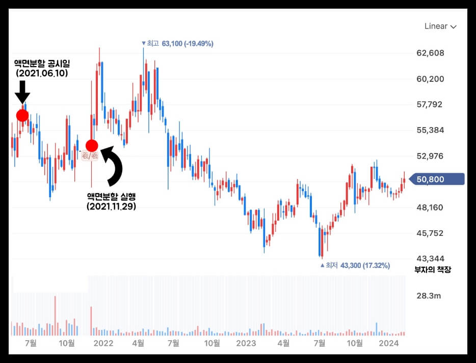 하지만 장기적으로는 액면분할이 주가에 미치는 영향이 주로 기업의 기본적인 가치와 성장 가능성에 의해 결정됩니다. 액면분할 자체보다는 기업의 실적, 산업 내 위치, 경제 환경 등이 주가에 더 큰 영향을 미치는 것을 알 수 있었습니다.