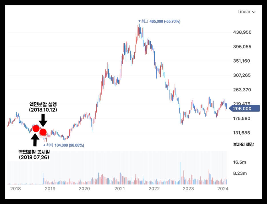 이번에는 지난번과는 다르게 액면분할과 인적분할을 동시에 진행하였습니다.