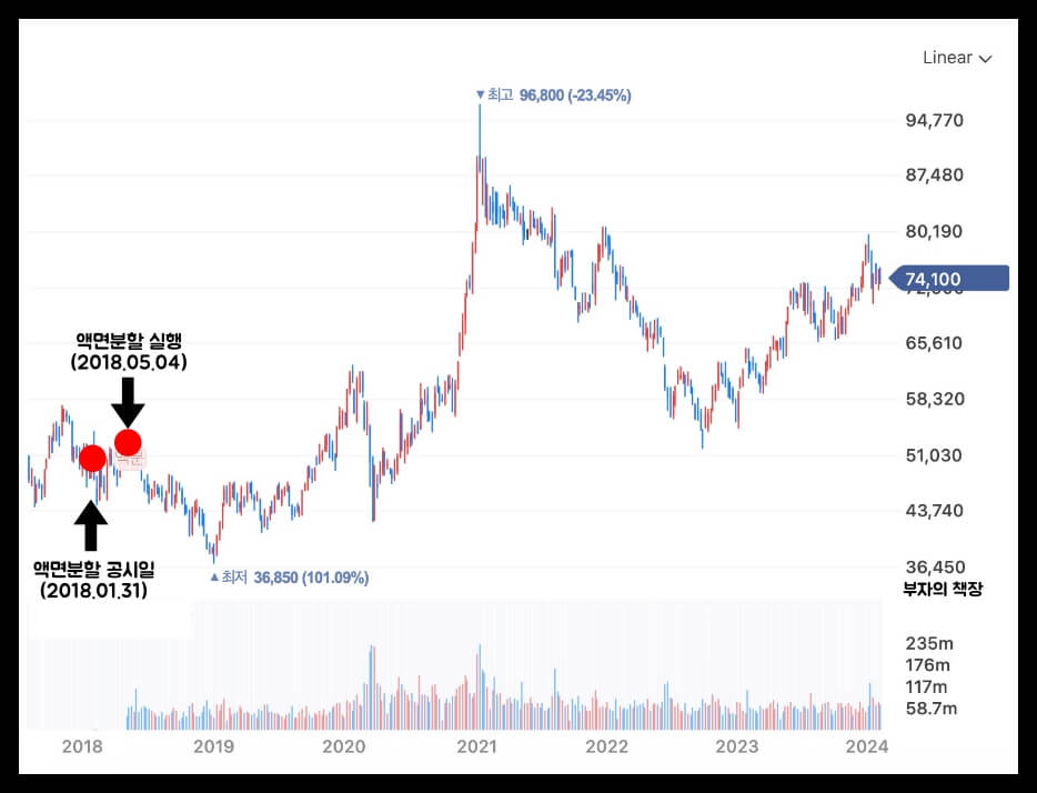 | 현재 주가 (24.02.08) | 74,100 (액분전 약370만원 가치) |