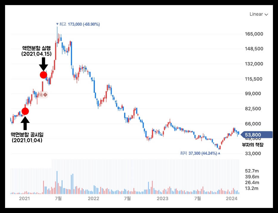 그 후 21년 6월 24일에 최고점인 17만 3천 원을 찍고 주가는 현재까지 우하향하며 현재 액면분할 가격보다 2배 넘게 하락하며 좋지 않은 흐름을 보이고 있습니다. 이는 액면분할 때문이 아닌 외부적인 요인에 더해 문어발식 경영 이슈 등 카카오 기업의 각종 소송과 규제 관련 이슈 등으로 주가하락에 큰 영향을 준 것으로 보입니다.