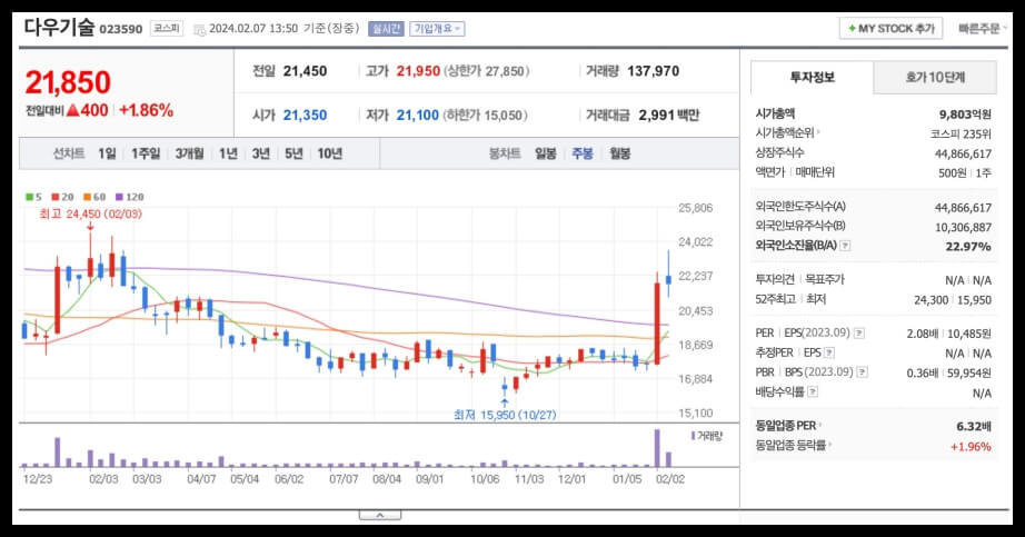 - 재무 안정성: 다우기술은 PER이 2배로 매우 안정적인 수치를 보이고 있으며, 대주주가 45.2%의 지분을 보유하고 있어 안정적인 경영 환경을 유지하고 있습니다.