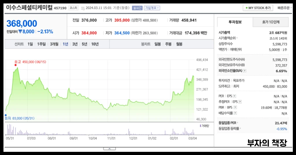 한농화성은 전고체 배터리 전해질을 개발하는 회사입니다. 최근 삼성 SDI가 '인터배터리 2024'에서 전고체 배터리(ASB)의 양산을 위한 비전을 제시하면서 한농화성의 주가가 급등했습니다.