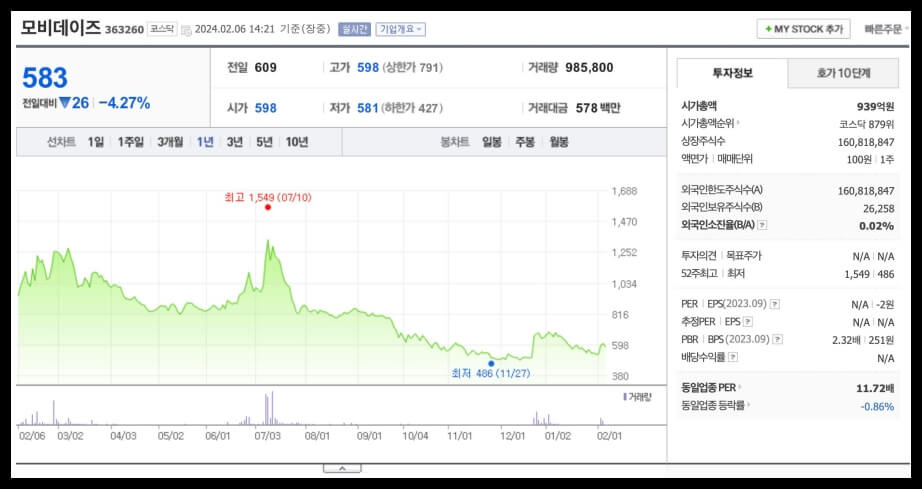 - 미래성장성: 모비데이즈는 틱톡샵의 한국 진출 준비 소식에 상한가를 기록(23.12.21) 하기도 하였습니다. 틱톡샵과 같은 글로벌 전자상거래 플랫폼과의 파트너십을 통해 매출과 주가는 긍정적일 것으로 기대됩니다. 특히 틱톡샵의 올해 글로벌 총 거래액(GMV)의 목표가 500억 달러로 선정된 점은 모비데이즈의 매출에도 긍정적인 영향을 미칠 것으로 예상됩니다.