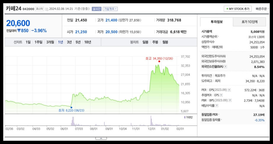 - 재무상태: 카페 24의 23년 매출액은 2,759억 원으로 전년대비 1.2% 감소하였으나 당기순이익은 105% 증가하여 흑자전환에 성공하였습니다. 23년 4분기 기준 전체 자산총계는 3,203억 원이고 부채총계는 1,595억 원으로 자산대비 부채비율은 높은 편으로 보입니다.