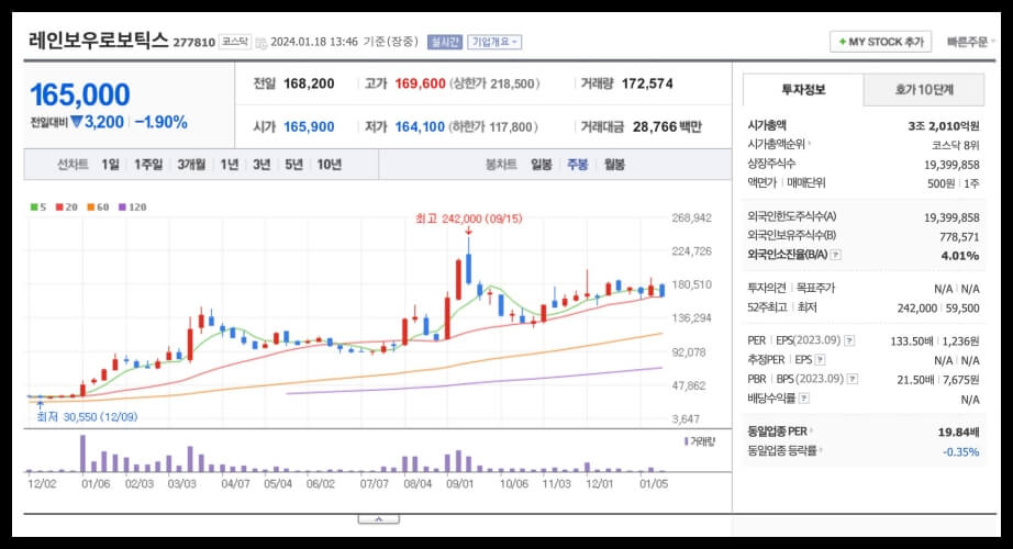 - 삼성전자와의 관계 및 시장 기대감: 인간형 이족보행로봇과 협동로봇에 중점을 둔 레인보우로보틱스는 삼성전자와의 관계를 통해 로봇사업에서 큰 기대를 받고 있습니다. 삼성전자가 지난해 초 980억을 투입해 레인보우로보틱스의 지분 15%를 매입하였습니다.