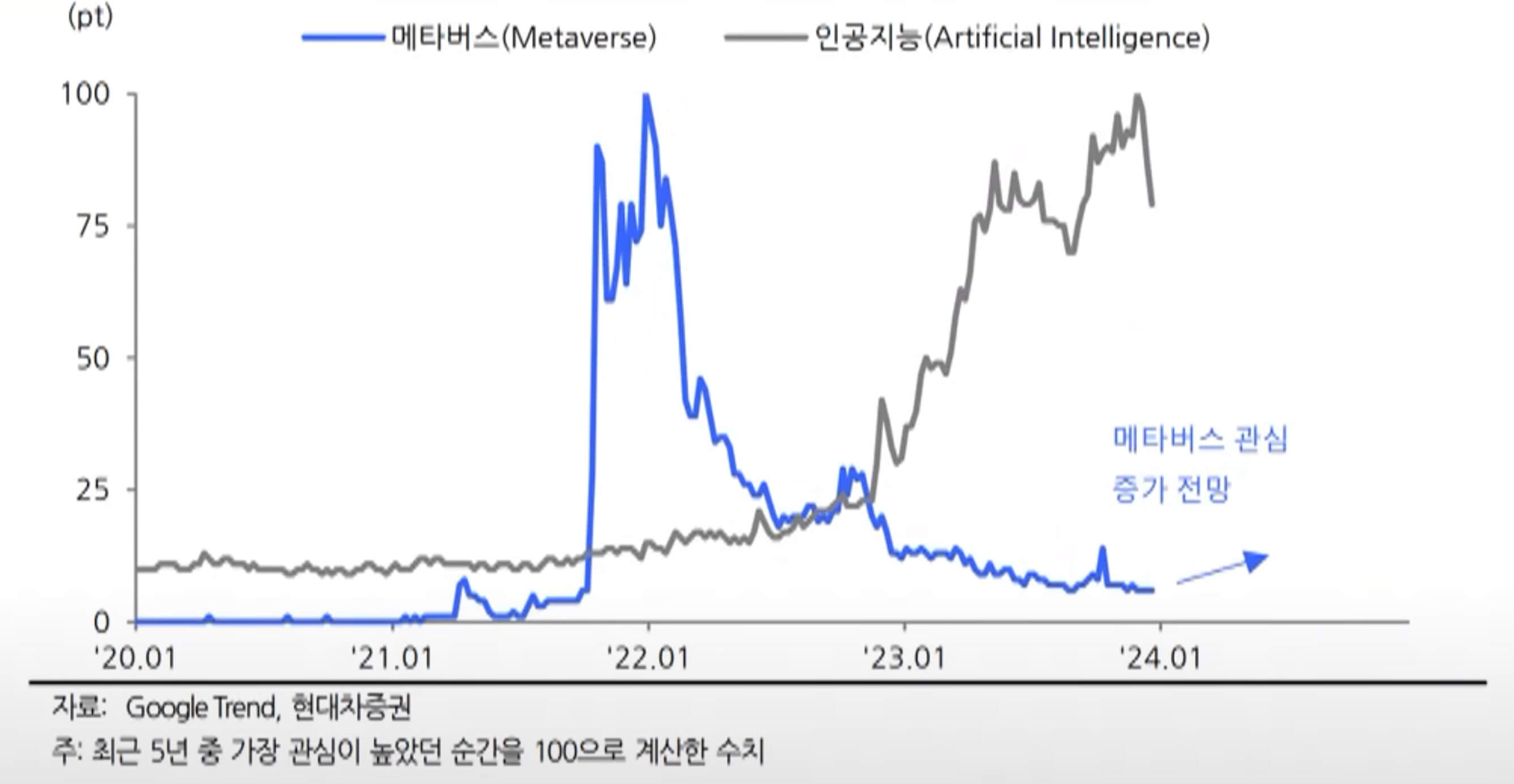 22년 초에 대세였던 메타버스에 대한 관심도는 23년부터 인공지능 AI 분야에 역전되었습니다.